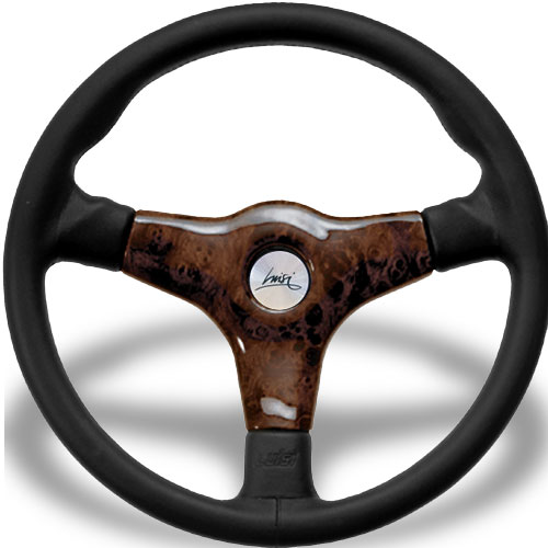 The Giba 3 is a 14" black leather steering wheel made by Luisi in Italy. The center has 3 spokes covered in Mahogany Burl Wood.