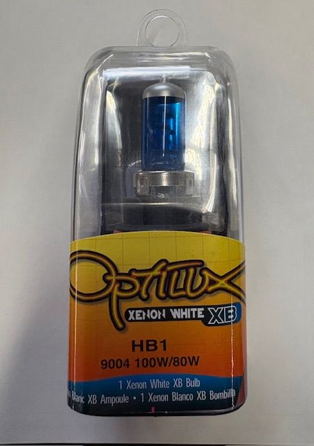 Optilux Xenon White XB HB1, 9004 12V 100w/80w bulb. Please note that bulb glass appears blue, but shines bright white.